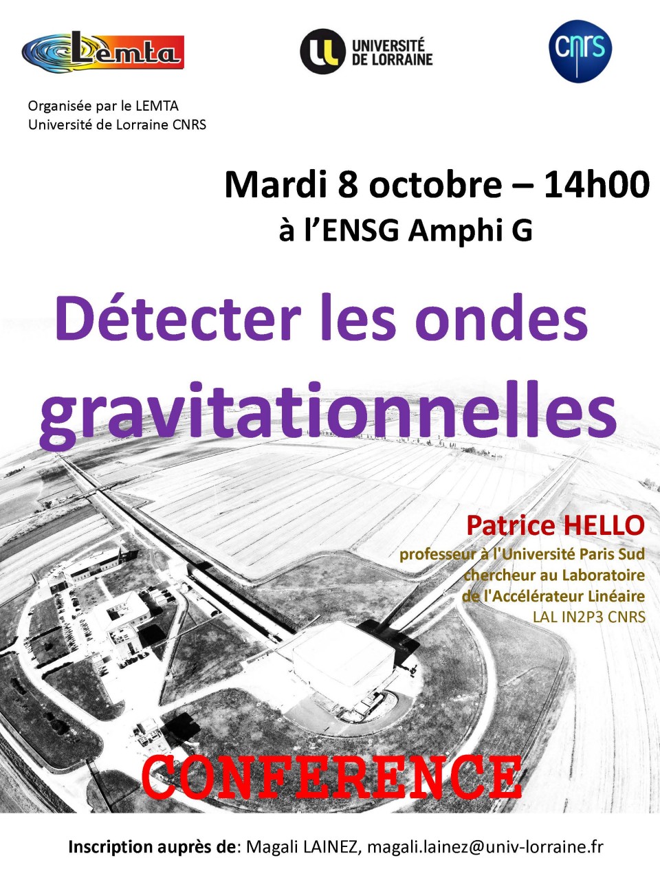 Le LEMTA organise le mardi 8 octobre à 14h dans l'amphithéâtre G de l'ENSG une conférence de Patrice Hello, professeur à l'Université Paris-Sud et chercheur au Laboratoire de l'Accélérateur Linéaire (LAL IN2P3 CNRS), intitulée "Détecter les ondes gravitationnelles".