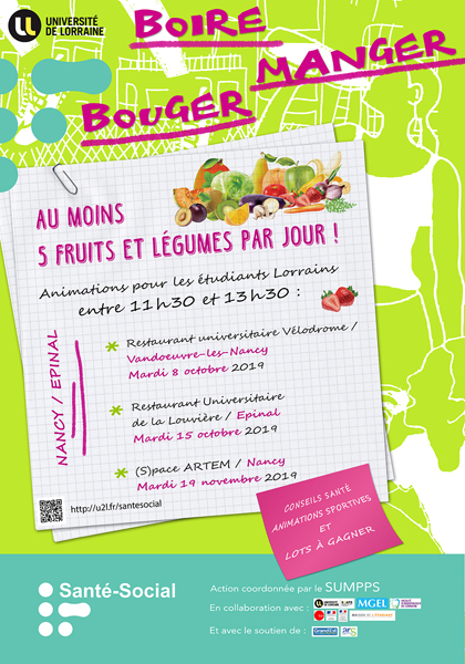 Le Service Santé Social des étudiants (SUMPPS) site Lorraine sud de l’Université Lorraine (UL) propose, du 8 octobre au 19 novembre 2019, une campagne d’information et de prévention autour du thème BOIRE MANGER BOUGER (BMB), avec le soutien de l’ARS et de la Région Grand Est, et en collaboration avec le CROUS, le Service des Sports Universitaire de l’UL (SUAPS), la Faculté d’Odontologie de l’UL, la MGEL, la Maison de l’Etudiant (MDE) d’Epinal, le ministère des Solidarités et de la Santé et le ministère de l’Enseignement Supérieur, de la Recherche et de l’Innovation.