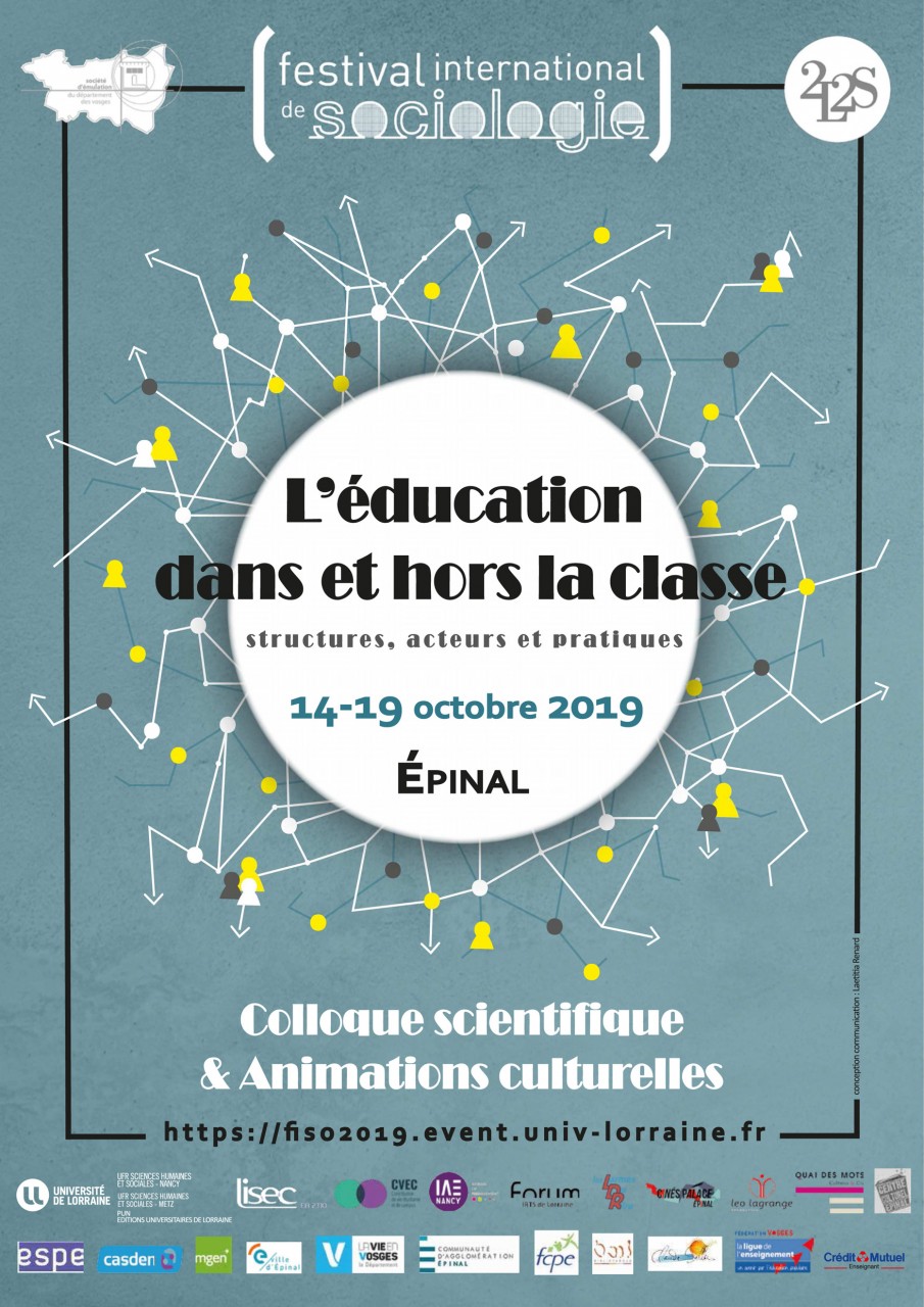 Co-organisé par le Laboratoire lorrain de sciences sociales et la Société d'émulation du département des Vosges, le Festival international de sociologie (FISO) après s'être intéressé aux figures de l’engagement (2015) et à la fabrication des corps au XXIe siècle (2017) aborde en 2019, du 14 au 19 octobre, un fait social central dans l’œuvre d’Émile Durkheim : l’éducation. Celle-ci, selon ce savant, auteur de Éducation et sociologie (1922), aide à la constitution de l’être social contenu en chacun des hommes. Sans suivre complètement ses traces, les organisateurs proposent de revenir sur le processus de socialisation méthodique de la jeune (et moins jeune) génération. Le regard est, en effet, décentré et porté, non plus sur le cœur du geste éducatif par lequel le maître forme socialement l’élève, lui imprime les idées, les sentiments, « pour le mettre en harmonie avec le milieu dans lequel il doit vivre », mais sur les autres actions éducatives qui participent également de la formation de l’être social, en le façonnant tout en l’émancipant. Il ne s’agit pas, bien sûr, de minorer la place, le rôle et le travail des enseignant.e.s, mais, parce que la sociologie et les sciences de l’éducation s’y sont amplement consacrées, le FISO 2019 aborde les « éducations à… » (I.), les structures périphériques de formation (II.), les acteurs éducatifs invisibles et/ou invisibilisés (III.) et les formes alternatives d’éducation (IV.).