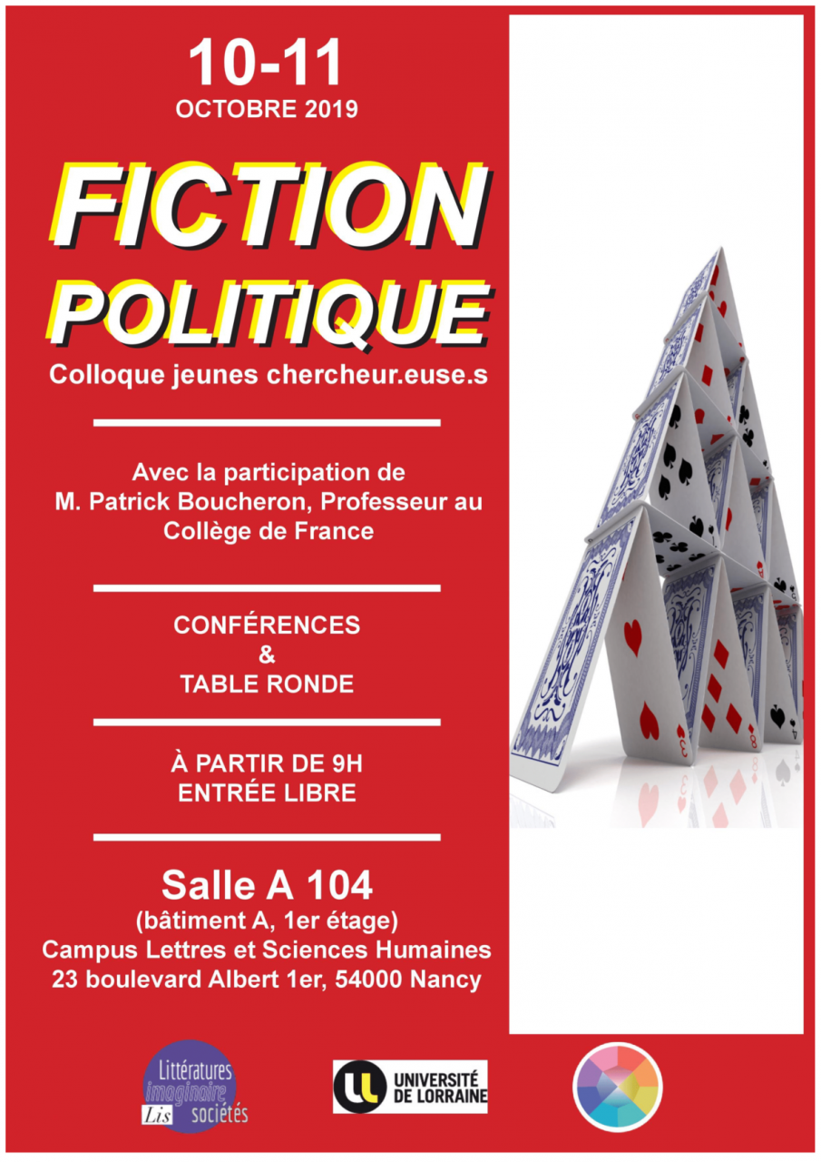 Le colloque Jeunes Chercheurs du LIS, intitulé "Fiction Politique", aura lieu du jeudi 10 au vendredi 11 octobre 2019, sur le campus de Lettres Sciences Humaines à Nancy, en salle A 104.