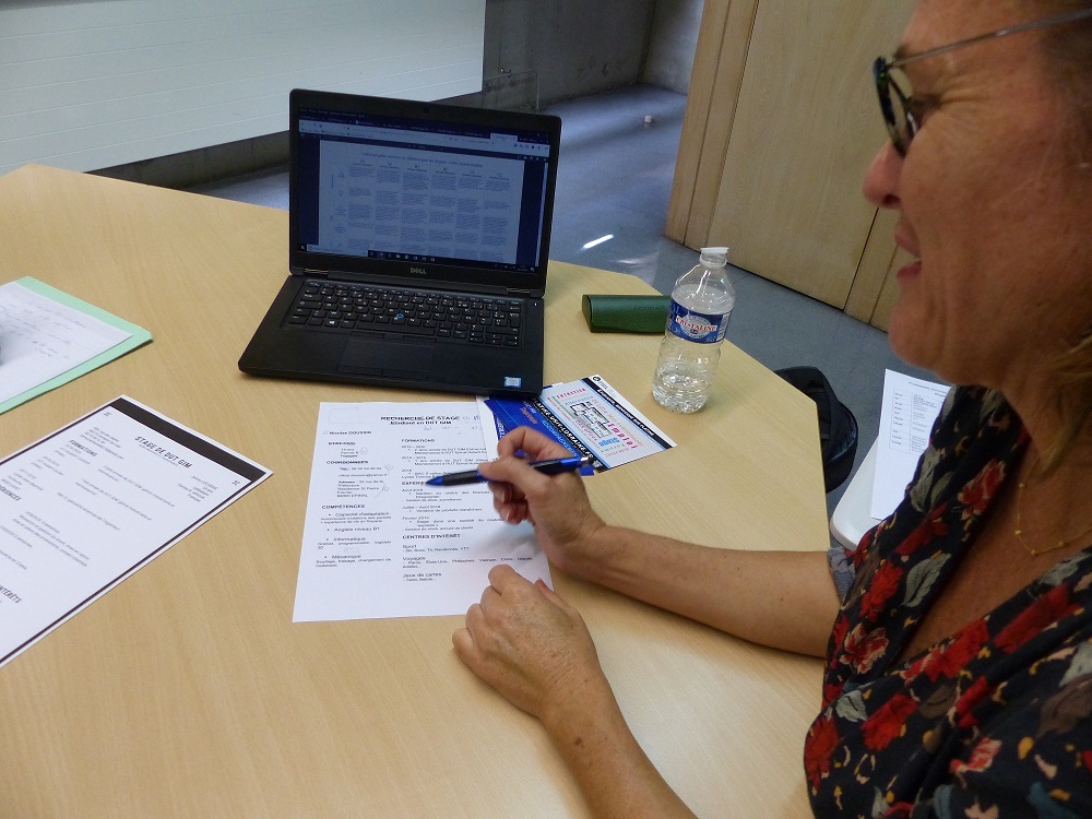 - des ateliers d'aide à la rédaction de CV et lettres de motivation animés par Géraldine BAVIERE-MARIE, Sylvaine CHEVALIER-ROTHAN, Stella GOUYER et Jocelyne RUSINOWITCH du SOIP de l'Université de Lorraine ;