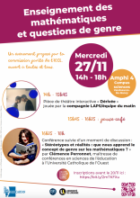 16h15 - 18h : Conférence suivie d'un moment de discussion : "Stéréotypes et réalités : que nous apprend le concept de genre sur les mathématiques ?", par Clémence Perronnet, maîtresse de conférences en sciences de l'éducation à l'Université Catholique de l'Ouest.
