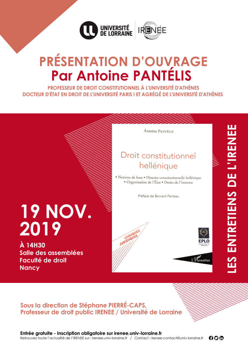 Lors des entretiens de l'IRENEE, Antoine PANTELIS (Professeur de droit constitutionnel à l'Université d'Athènes, docteur d'État en droit de l'Université Paris I et agrégé de l'Université d'Athènes) viendra présenter l'ouvrage "Droit constitutionnel hellénique" (éditions L'Harmattan).