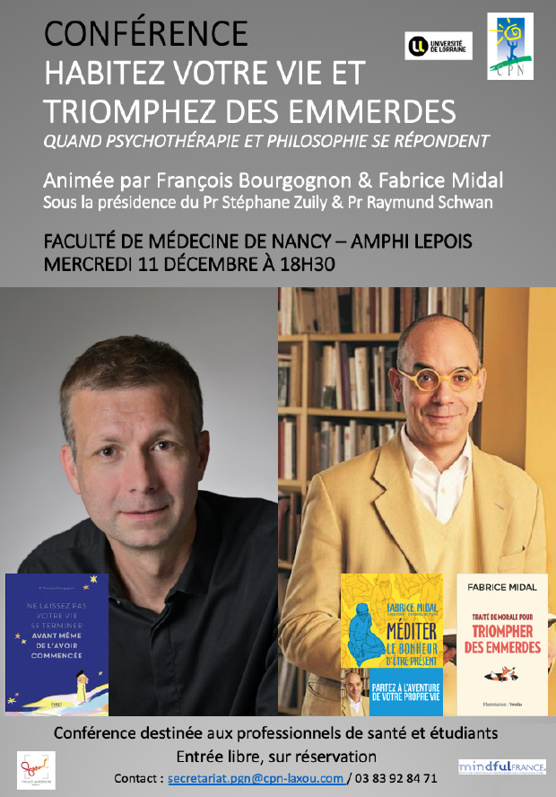 Conférence animée par Fabrice Midal (Philosophe et écrivain, auteur de plusieurs Best-sellers et fondateur de l’Ecole occidentale de méditation) et le Dr François Bourgognon (Psychiatre psychothérapeute formé aux thérapies comportementales et cognitives (TCC) et à la thérapie d’acceptation et d’engagement (ACT)), sous la présidence du Pr Stéphane Zuily (Cardiologue) et du Pr Raymund Schwan (Psychiatre).
