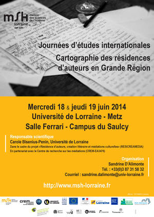 Ces 1ères journées d’étude internationales du projet RESICREAMEDIA seront consacrées à l’étude des différentes résidences d’auteur sur la Grande Région, avec pour thème central l’élaboration d’une cartographie comparative des résidences d’auteur à travers les quatre espaces patrimoniaux et territoriaux sélectionnés (Allemagne, Belgique, Lorraine, Luxembourg). Ainsi, il s’agira de rendre compte de la diversité des formes existantes sur l’ensemble des territoires en définissant chaque site et de saisir les enjeux des dispositifs mis en place dans chaque pays. Il s'agira également d'analyser les enquêtes menées sur les auteurs en résidence dans le but d’interroger le statut de l’écrivain dans ce dispositif, à partir de l’observation participante (lors des activités paralittéraires, du processus créatif et dans des moments plus intimes avec l’auteur en résidence) et d’entretiens semi-directifs (auprès des publics et des représentants institutionnels).