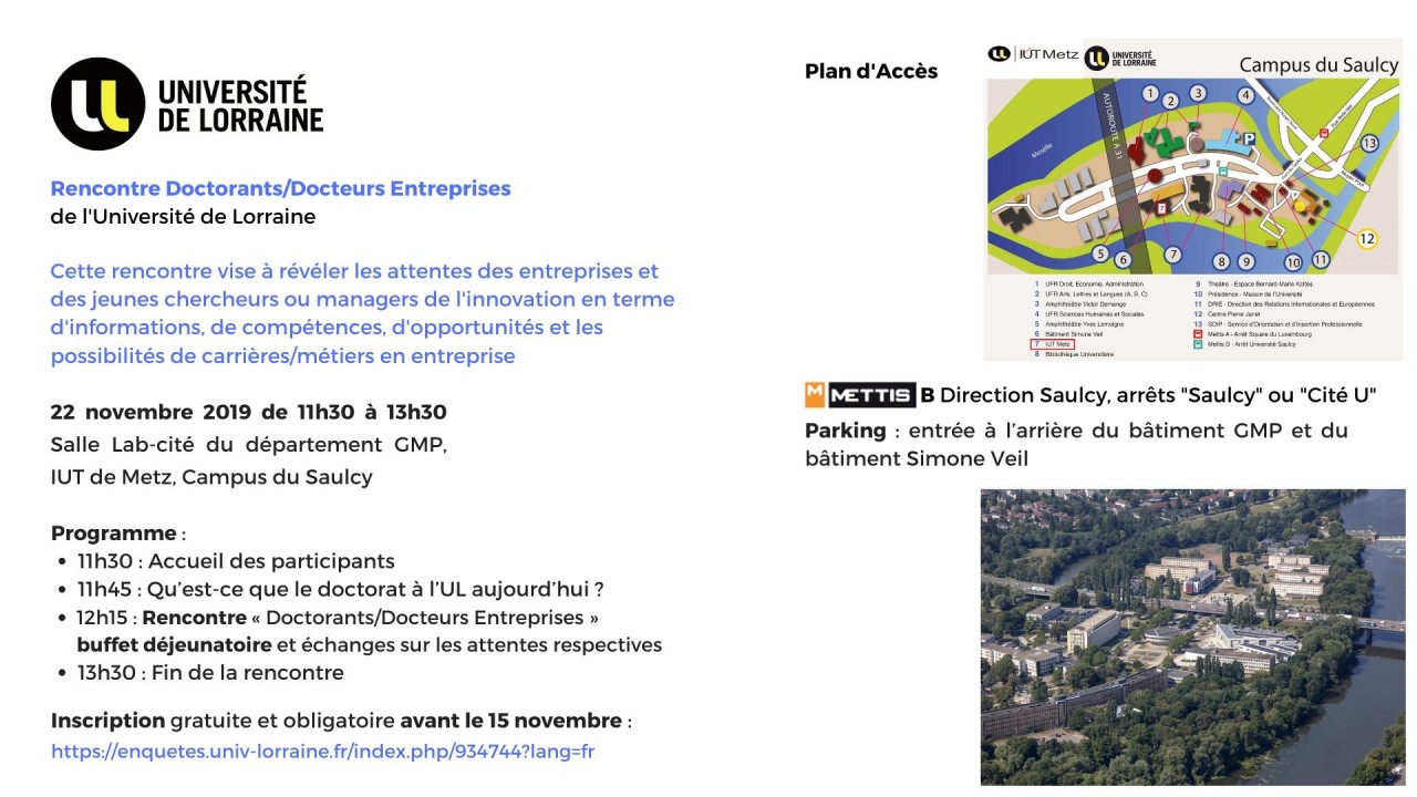Cet événement sera également l'occasion de vous présenter les différents dispositifs autour du doctorat ainsi que les dispositifs financiers et d’accueil/de recrutement des doctorants en entreprise.