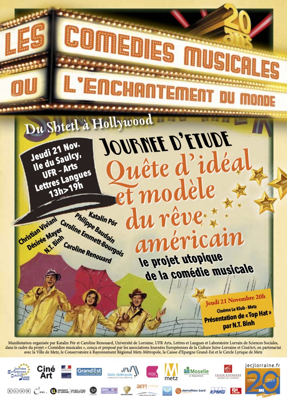 Cette journée d'étude s'inscrit dans le cadre du projet « Comédies musicales », conçu et proposé par les associations Journées Européennes de la Culture Juive-Lorraine et CinéArt, en partenariat avec l'Université de Lorraine (UFR Arts, Lettres et Langues de Metz et Laboratoire Lorrain de Sciences Sociales), la Ville de Metz, le Conservatoire à Rayonnement Régional Metz-Métropole, la Caisse d’Epargne Grand-Est et le Cercle Lyrique de Metz.