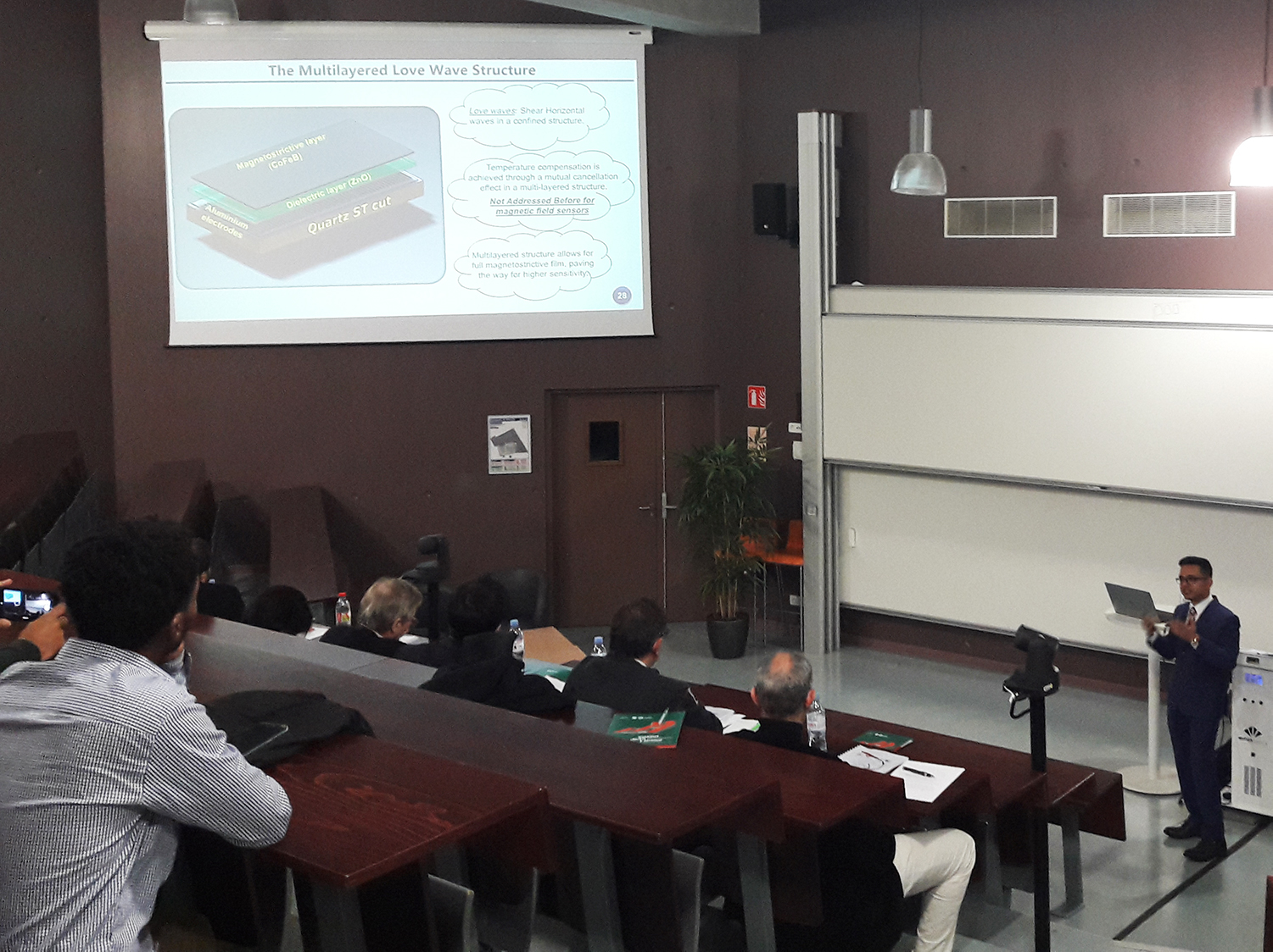 Les capteurs magnétiques disponibles de nous jours ont un certain nombre de limitations. Certains ont besoin de beaucoup d’énergie pour opérer, beaucoup fonctionnent avec des câbles et les capteurs utilisés pour des applications hautement sensibles requièrent des mécanismes de refroidissement conséquents. Notre solution pour nous affranchir de ces problèmes et de concevoir le dispositif Ondes Acoustiques de Surface (OAS) pour la captation de champs magnétiques. Ces dispositifs sont non seulement de petite taille, mais capable de fonctionner sans fils. Le défi cependant, c’est qu’il y a de nombreux paramètres, à la fois au niveau quantique de la physique et en termes d’ingénierie de l’outil au niveau macro, qui doivent être pris en compte. Le défi supérieur, c’est que tous ces paramètres sont interconnectés, rendant le principe de fonctionnement difficile à comprendre et donc à manufacturer. Ma thèse se trouve donc à l’interface entre la physique et l’ingénierie et est une tentative de rapprocher ces deux champs d’étude ainsi que le travail de deux équipes de l’IJL : Nano-magnétisme et Electronique de Spin et Micro/Nano-systèmes.