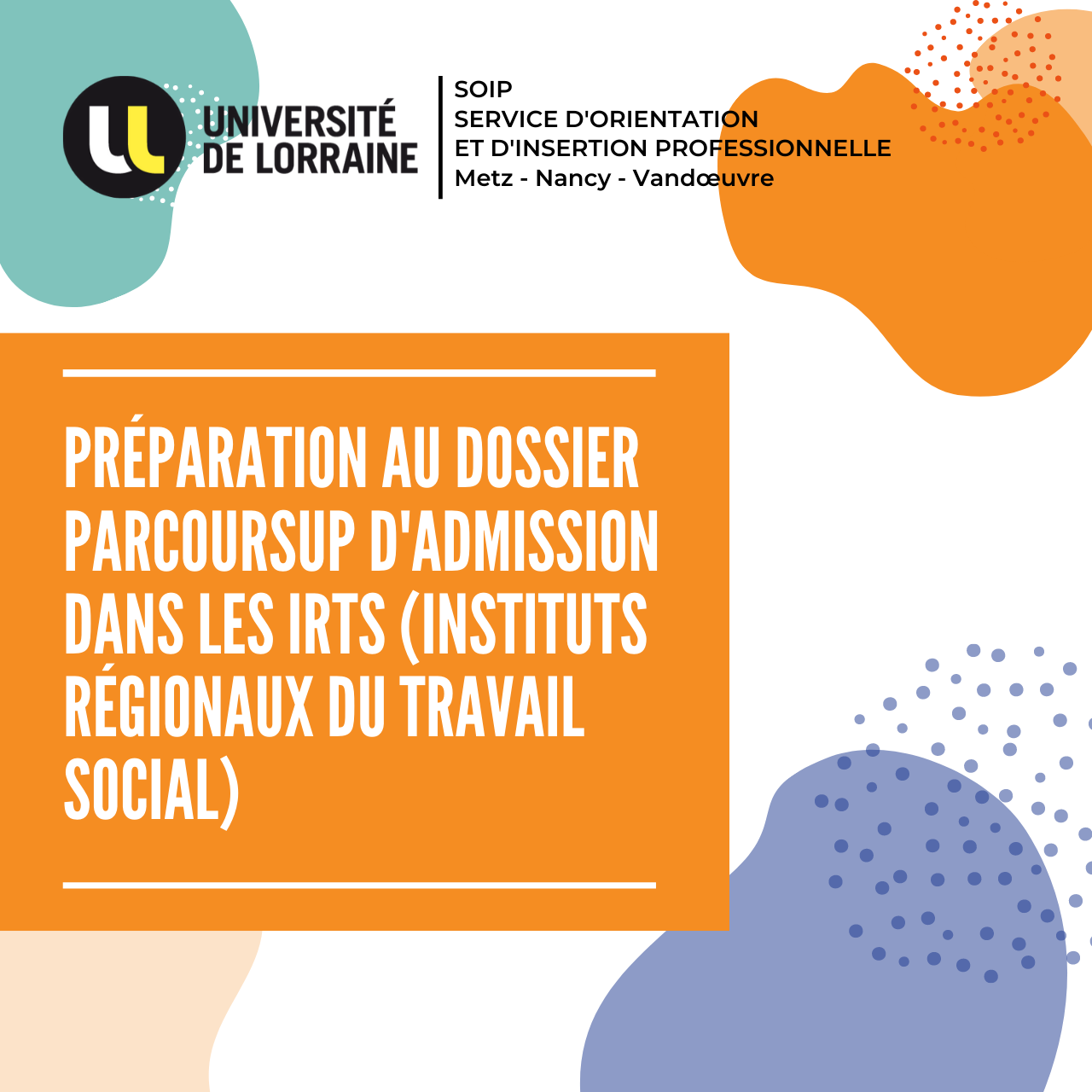 Alors, ne manquez pas la réunion d'information, à venir le 9 décembre, sur les nouvelles modalités d’inscription à l’IRTS (Institut régional du travail social de Lorraine) et sur la préparation au dossier de candidature sur Parcoursup et à l'oral d'admission, organisée par le SOIP-Nancy.