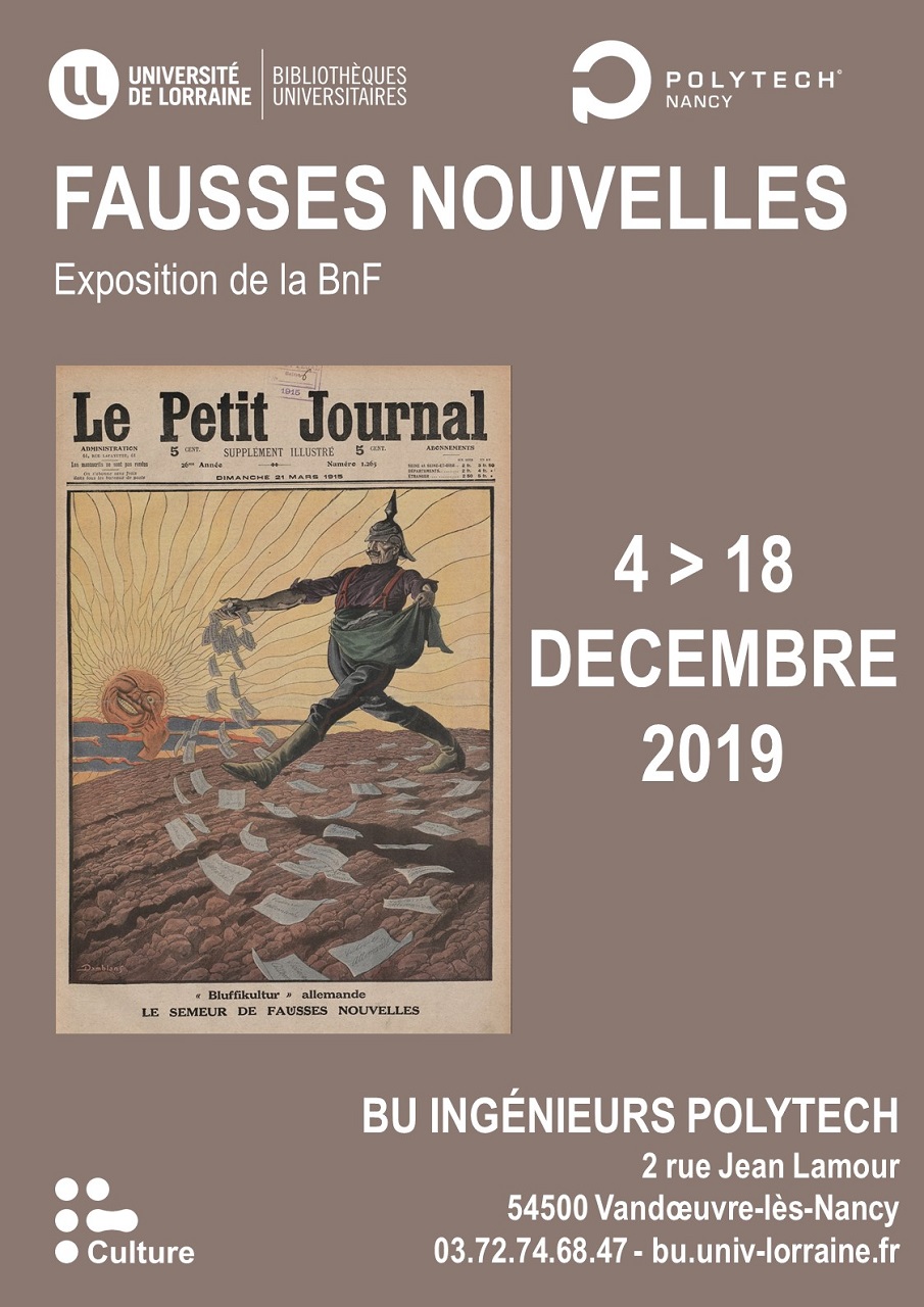 « Désinformation, mensonge, canular, propagande, la « fausse nouvelle » a été remise au goût du jour sous l’appellation de « fake news » puis de « infox ». Mais elle ne date pourtant pas d'hier. La Bibliothèque nationale de France et le CLEMI (Centre pour l’éducation aux médias et à l’information) proposent de traiter cette question essentielle pour notre démocratie par l’étude des documents patrimoniaux. Cette exposition pédagogique en affiches propose des outils et des pistes de réflexion permettant de se repérer, de trier, d’identifier les sources et l’information pertinente pour cultiver l’exercice citoyen d’un doute méthodique ».