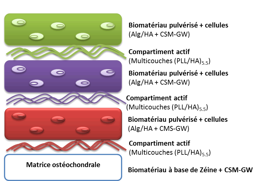 Lorsqu'il est endommagé, par exemple par des maladies dégénératives telles que l'arthrose, le cartilage n'est pas en mesure de se régénérer. Alors comment réparer une lésion dans le cartilage sans devoir installer une prothèse au patient ? « La matrice cartilagineuse est constituée de plusieurs strates [voir le schéma] dont les cellules présentent des caractéristiques différentes, adaptées aux sollicitations mécaniques dont elles sont l'objet » explique Rachid Rahouadj, professeur au Laboratoire Energétique et Mécanique Théorique et Appliquée (LEMTA). Voilà pourquoi des mécaniciens collaborent avec les biologistes du laboratoire d'Ingénierie Moléculaire et Physiopathologie Articulaire (IMoPA). « Nous avons besoin d'un support dans lequel cultiver les cellules. Ce biomatériau doit combler une lésion et se résorber à mesure que la nouvelle matrice tissulaire se développe » poursuit Céline Huselstein, maître de conférences à l'IMoPA et porteuse du projet BiMIO, lauréat de l'appel Projets Exploratoires Premier Soutien (PEPS Mirabelle 2014) organisé par l'Université de Lorraine et le CNRS.