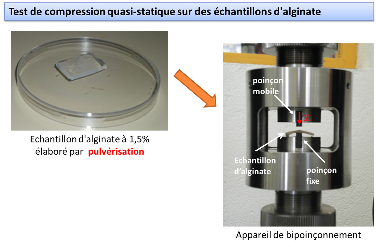 La forme optimale de la structure du biomatériau qui accueillera les cellules reste à déterminer. Celui-ci devra offrir les mêmes propriétés mécaniques tout au long de son évolution [exemple de tests de compression] jusqu'à sa totale résorption au profit de la matrice cellulaire saine et fonctionnelle. En revanche, le matériau utilisé est bien connu des cuisini(ers/ères) : il s'agit d'alginate [voir photo]. Grâce aux résultats d'un projet ANR (Agence Nationale pour la Recherche) antérieur, les chercheurs savent utiliser des couches de polyélectrolytes comme « colle » entre des couches d'alginate renfermant les cellules souches... « Comme un mille-feuille » plaisantent en coeur les deux chercheurs. [voir le schéma]