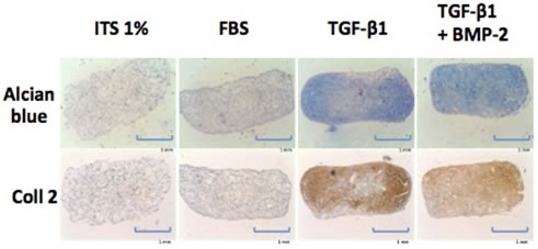 Dans les deux premières colonnes (ITS, FBS) on observe peu de réplication des cellules et une quasi absence de synthèse de matrice cartilagineuse. En revanche, grâce à un enrichissement du milieu de culture par 1 (TGFß1) ou 2 (TGF puis BMP2) facteurs de croissance, les cellules souches adoptent un phénotype d’allure chondrocytaire : elles synthétisent alors des constituants spécifiques du cartilage articulaire : protéoglycannes (coloration bleu alcian) et collagène de type II (immuno-marquage).
