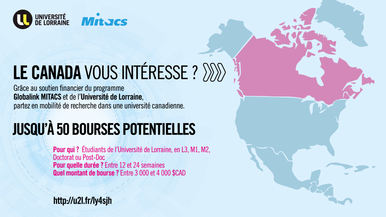 Le partenariat signé entre l'Université de Lorraine et l'organisme canadien MITACS garantit annuellement aux étudiants de l'Université de Lorraine 50 bourses pour effectuer des séjours de recherche dans un établissement universitaire ou un centre de recherche au Canada. Il s'agit des programmes Stages de recherche Globalink et Bourses de recherche Globalink.