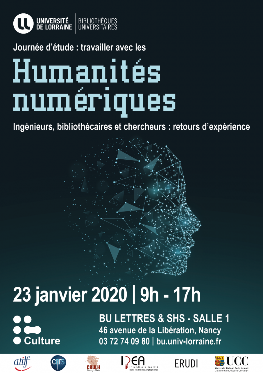 La Direction de la documentation et de l'édition en collaboration avec l’ATILF propose une journée autour des Humanités Numériques Travailler avec les Humanités Numériques - Ingénieurs, bibliothécaires et chercheurs : retours d’expérience le Jeudi 23 janvier 2020 à la Bibliothèque universitaire de lettres, sciences humaines et sociales de Nancy - Salle 1.