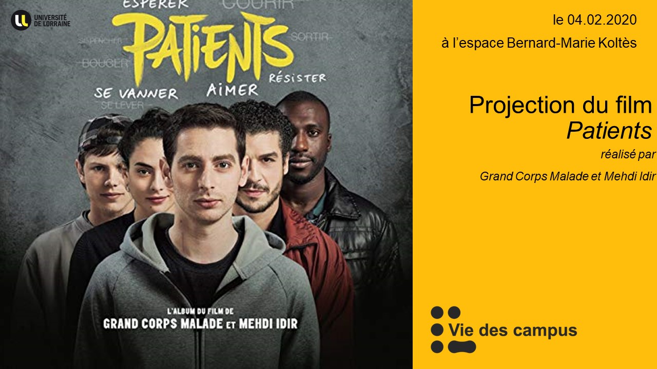 Projection (gratuite) du film Patients à l'Espace BMK. Le mardi 4 février 2020. L'ouverture des portes se fera à partir de 18h, la projection débutera à 18h30.
