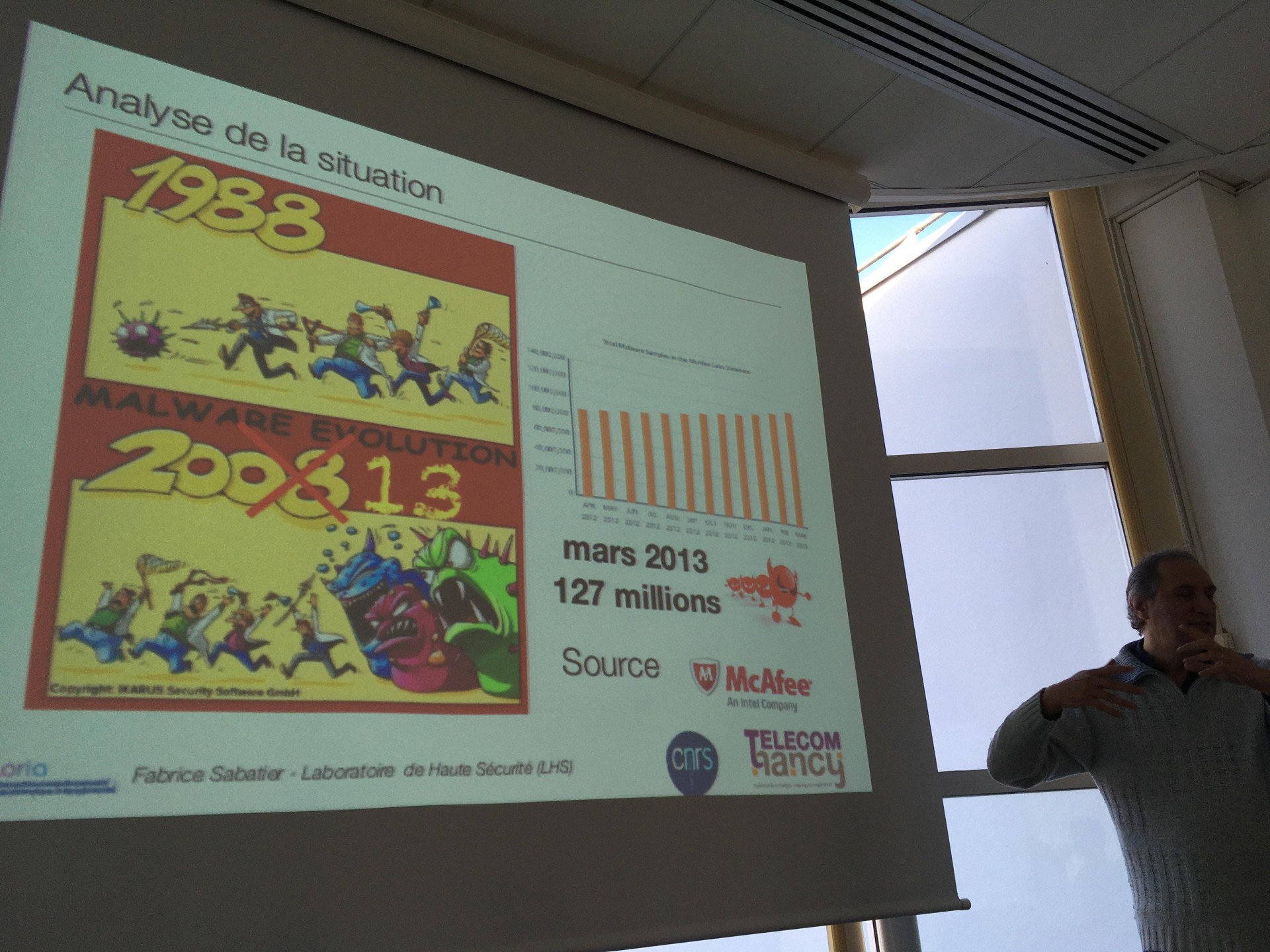 Fabrice Sabatier nous a éclairé sur les différents types de malwares (malicious software), codes malveillants qui attaquent les ordinateurs, les smartphones et les objets connectés. Ainsi nous distinguons botnet, spyware, trojan, spyware, adware et ransomware.