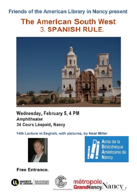 Neal Miller ouvre le cycle des conférences de l’année 2020 pour l’association des Amis de la Bibliothèque Américaine de Nancy et vous présente le 3ème volet de la série The American South West intitulé : Spanish rule.