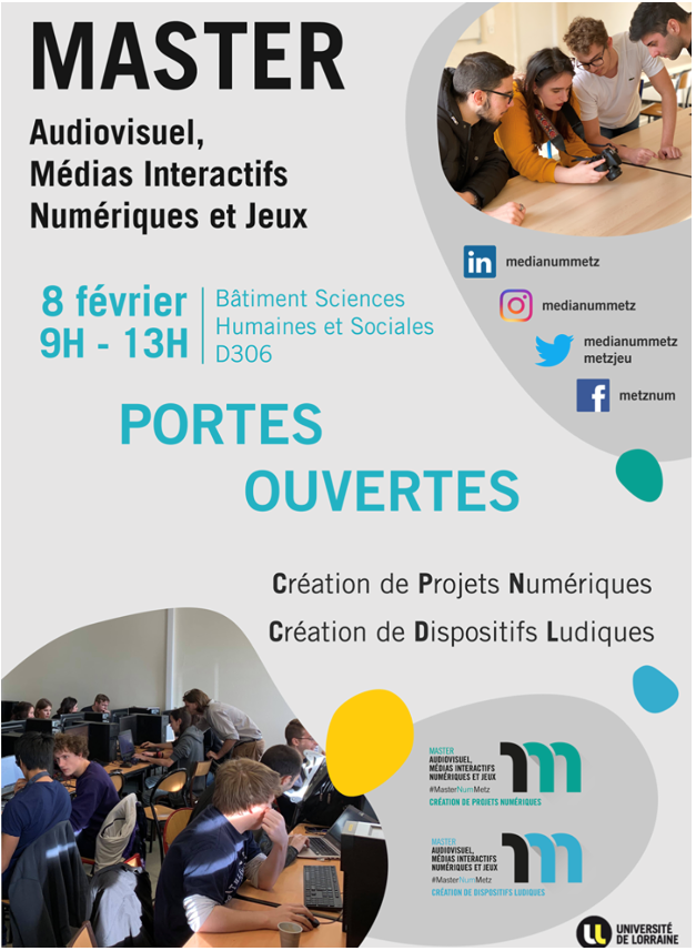 Dans le cadre des journées portes ouvertes de l'UFR Sciences Humaines et Sociales de Metz, les étudiants du Master Créations de Dispositifs Ludiques et Création de Projets Numériques présenteront leurs travaux.