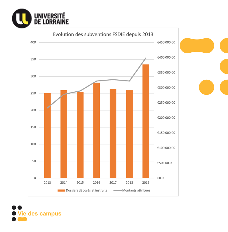 Les subventions du FSDIE sont accordées aux associations labellisées UL, qui ont un « objet résolument tourné vers le public étudiant de l’Université de Lorraine » comme énoncé dans les critères définis pour 2020. Les subventions peuvent être attribuées pour : des projets initiés, organisés et gérés par les associations labellisées, un équipement ou encore le fonctionnement courant de ces associations.