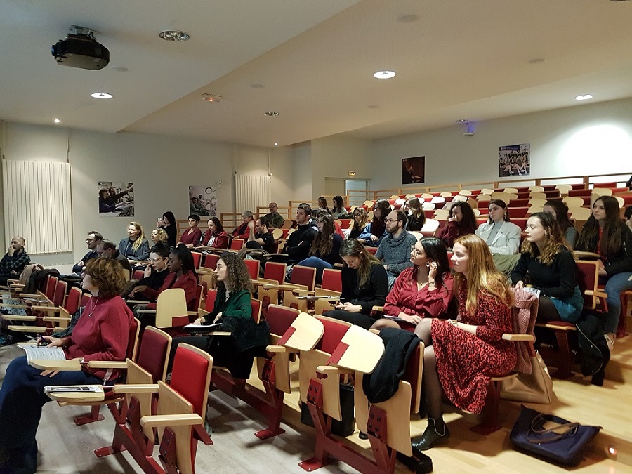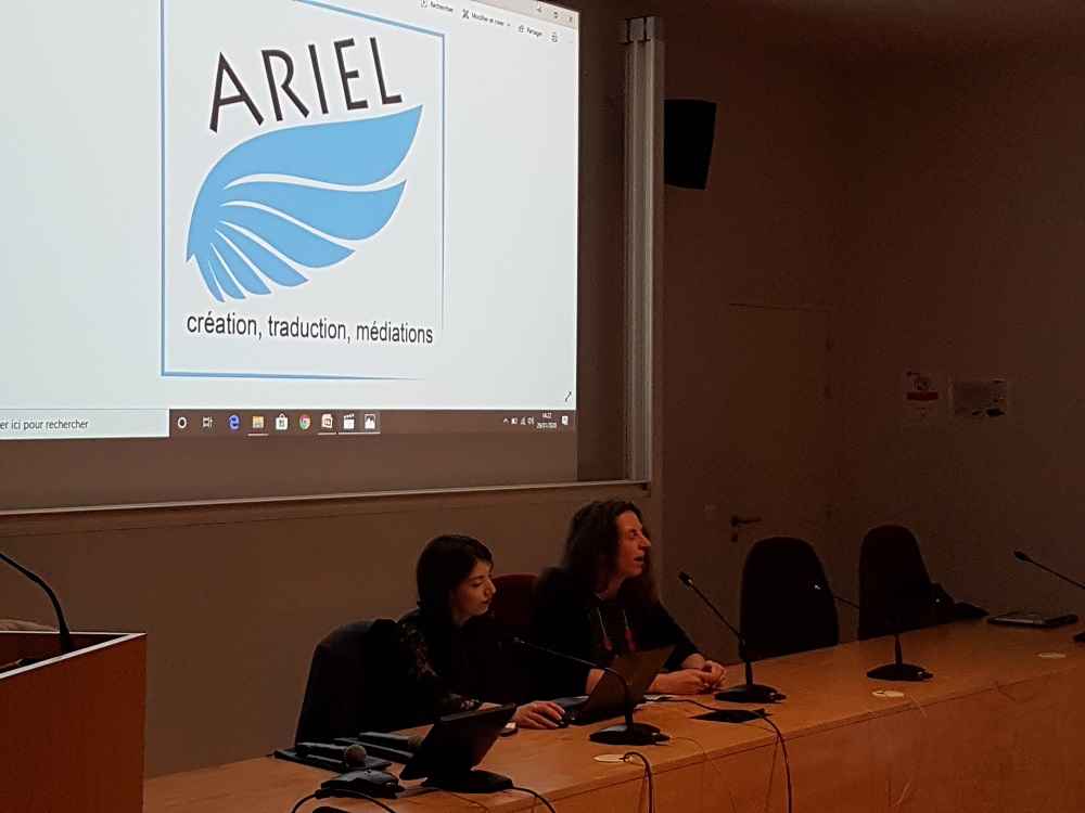 Le public, venu nombreux à l’amphithéâtre de la Présidence de l’Université de Lorraine, a pu retracer les moments clés de cette résidence grâce à des diaporamas – préparés, entre autres, par l’étudiante en Études Slaves Gohar Grigoryan, stagiaire pour le projet Ariel - qui ont fait dérouler des images inédites des différentes rencontres sur le campus, dans de nombreuses librairies de la Grande Région, mais aussi à l’Institut Culturel Italien de Strasbourg et dans les lycées où Laura Fusco est allée rencontrer les élèves d’Italien, de Français ou de Théâtre.