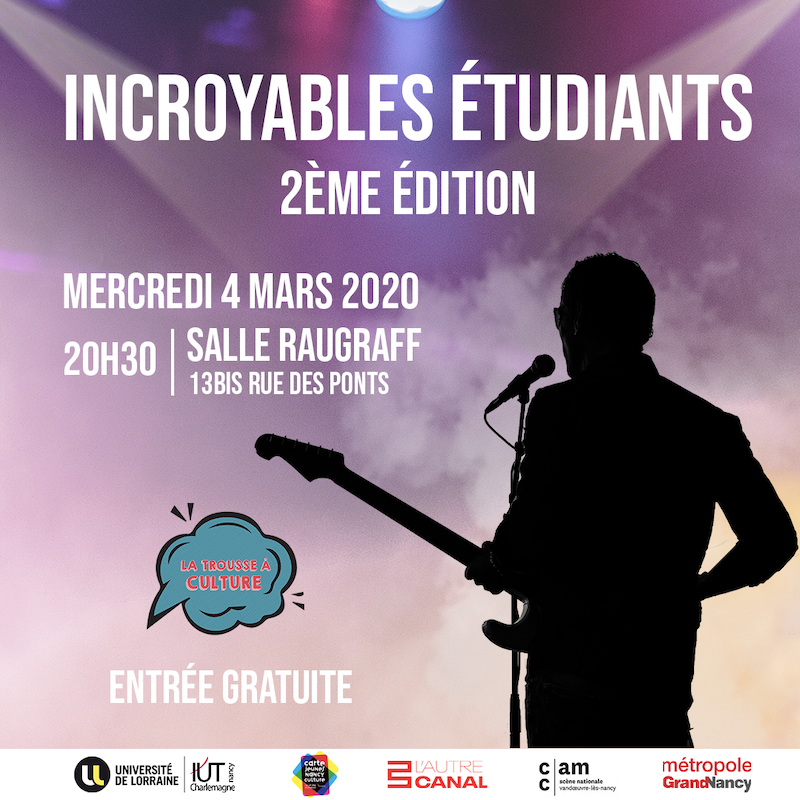 Après un véritable succès en 2019, la Trousse à Culture (projet tutoré mené par 7 étudiantes de l'IUT Nancy-Charlemagne), organise la seconde édition de Incroyables Étudiants le mercredi 4 mars 2020 dans la salle Raugraff de Nancy à 20h30.