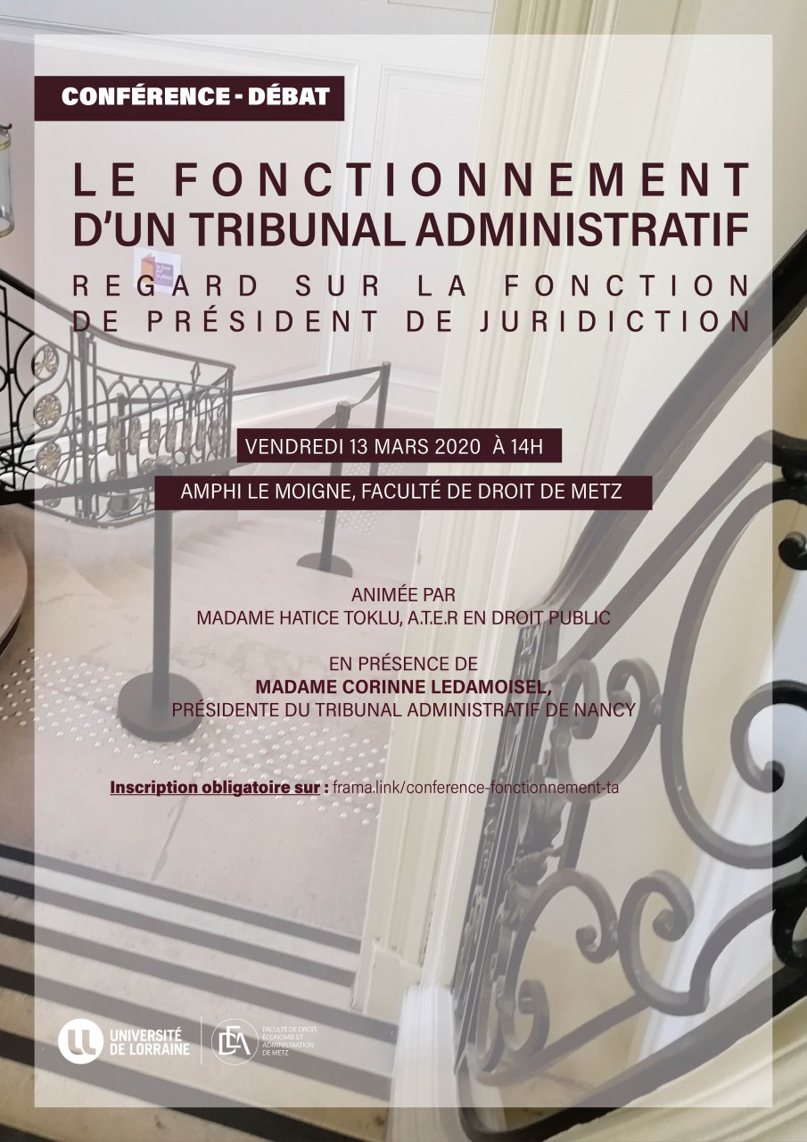 La conférence intitulée " le fonctionnement d'un tribunal administratif - regard sur la fonction de président de juridiction" est organisée à la faculté de droit, économie et administration de Metz, vendredi 13 mars 2020, en amphithéâtre Le Moigne.