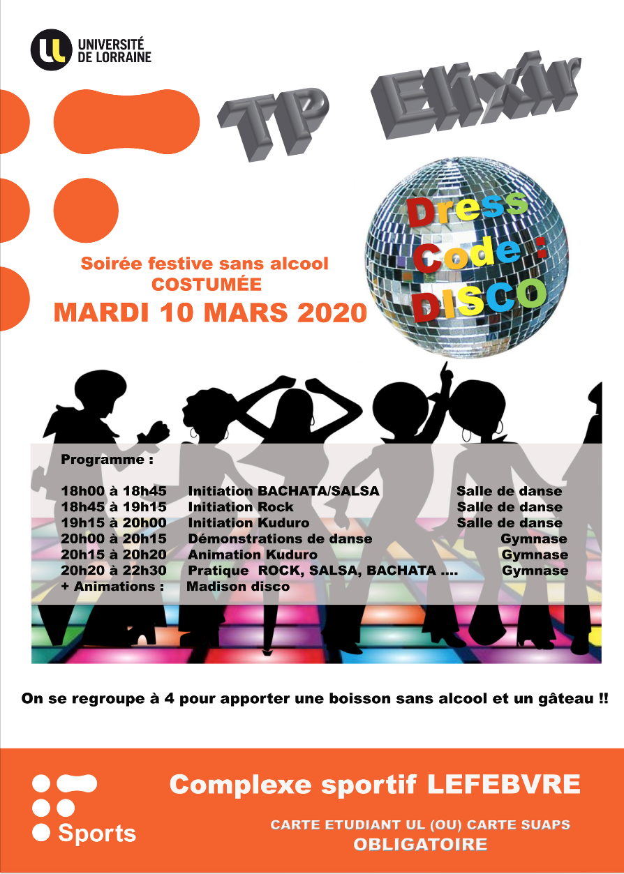 Le TP Elixir est une soirée festive sans alcool costumée qui se déroule le mardi 10 mars 2020 au complexe sportif Lefebvre.