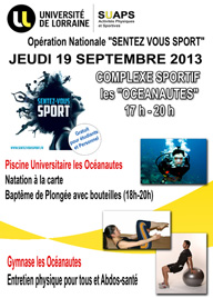 Le SUAPS de l’Université de Lorraine s’associe à l’opération nationale « Sentez Vous Sport » en organisant jeudi 19 septembre 2013, une animation sur le site des Océanautes (Rue de Verdun à Nancy) de 17 h à 20 h ouverte aux étudiants et personnel U.