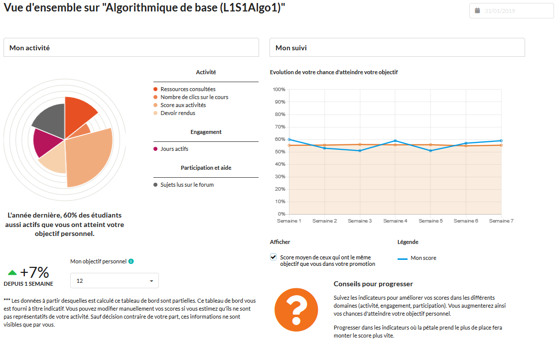 Le tableau de bord étudiant se divise en deux colonnes représentant deux types d’informations. La partie de gauche concerne l’activité de l’étudiant, les actions qu’il a effectuées au cours de son apprentissage. Ce rendu visuel de l’activité de l’étudiant lui permet d’identifier rapidement les actions qu’il pourrait effectuer pour progresser davantage. La partie de droite représente l’évolution des scores de l’étudiant au cours du temps. L’étudiant peut également, s’il le souhaite, afficher l’évolution du score moyen des étudiants de sa promotion. Enfin, quelques conseils sont promulgués aux étudiant pour les aider à interpréter les informations du tableau de bord et à se l’approprier.
