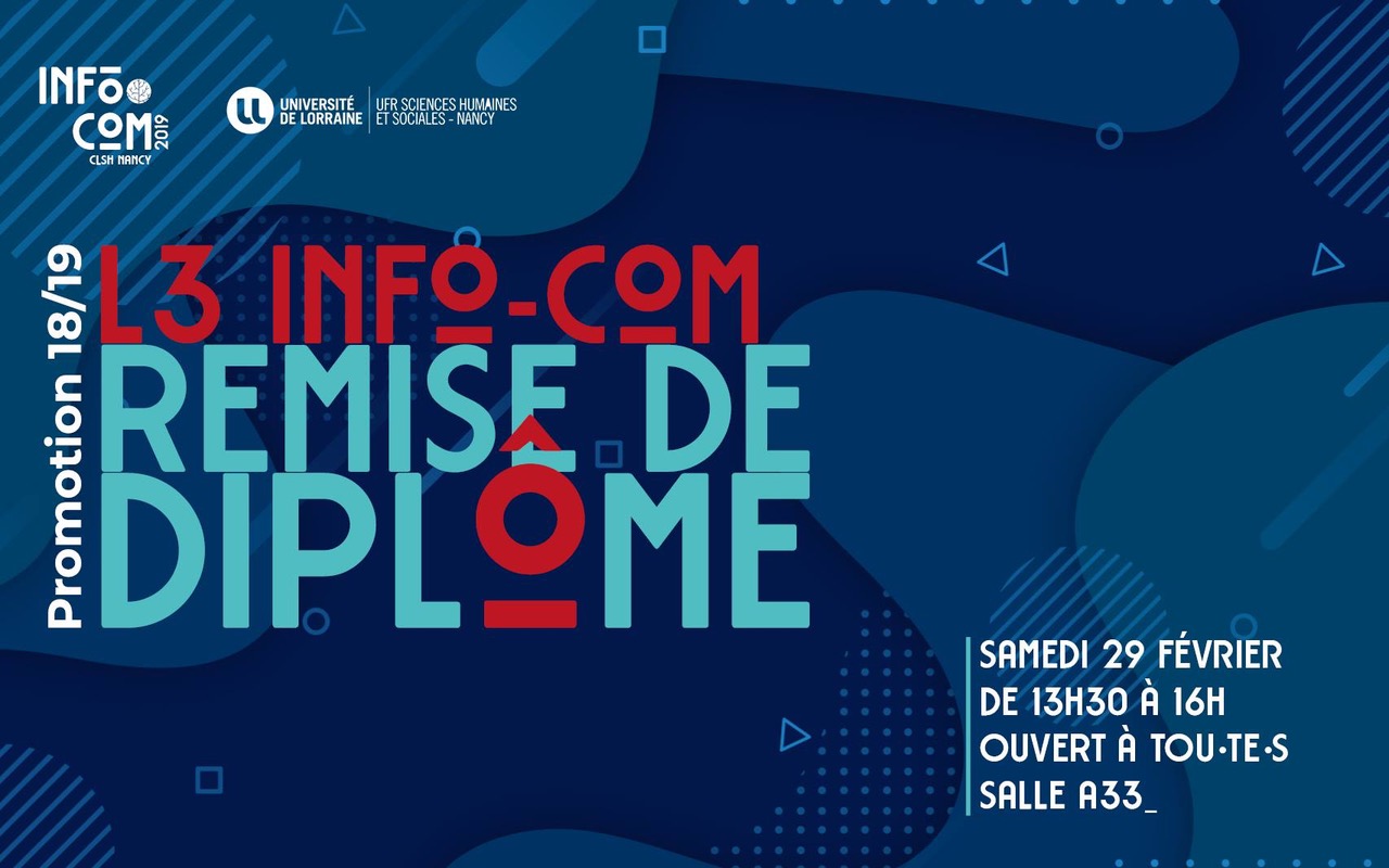 Samedi 29 février 2020 de 13h30 à 16h30, sur le Campus Lettres et Sciences Humaines de l’Université de Lorraine, s’est tenue la cérémonie officielle de remise des diplômes de licence Information Communication Nancy de la promo 2019. Cette cérémonie a eu lieu en présence du vice président délégué à la transformation pédagogique, Dominique Petitjean, de Stéphane Angles, directeur de UFR SHS Nancy et de Tourya Guaaybess, cheffe du département information communication de Nancy.