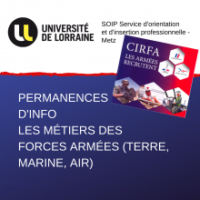 sachez que le CIRFA (Centre d’information et de recrutement des forces armées) tiendra, le jeudi 12 mars 2020, de 10h à 14h, une permanence dans les locaux de l'UFR Sciences humaines et sociales-Metz, sur le campus du Saulcy.