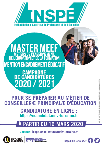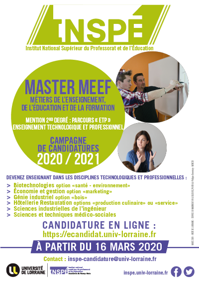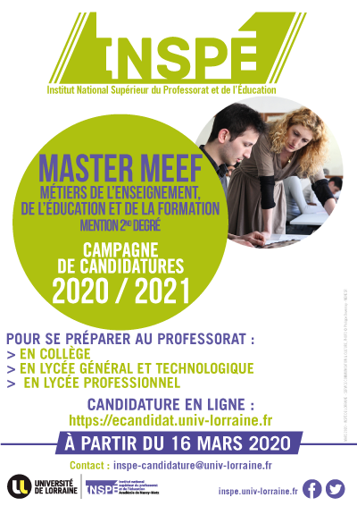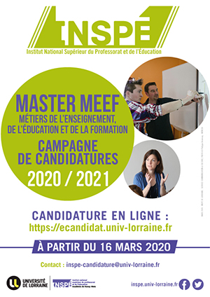 Pour la rentrée universitaire 2020-2021, la campagne de candidatures en master MEEF à l'INSPÉ de Lorraine ouvre le 16 mars prochain dans les mentions suivantes :
