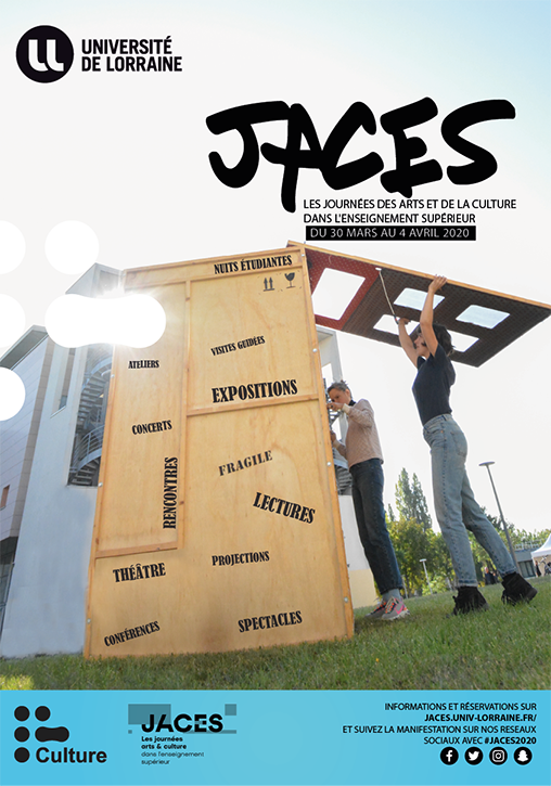 Les Journées des Arts et de la Culture (JACES) devait se dérouler du 31 mars au 4 avril 2020 au sein de l'Université de Lorraine. La crise sanitaire liée au Covid-19 ayant rendu la tenue de cette manifestation impossible, découvrez à distance ces actions artistiques et culturelles préparées par des étudiants, des associations et des personnels.