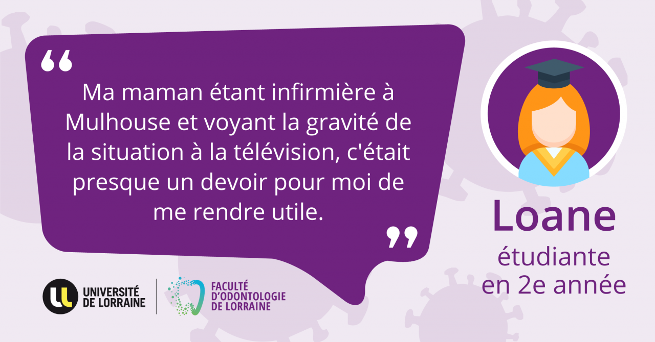 Loane est étudiante en 2e année à la faculté d’odontologie de Lorraine. Voyant le surcroît d’activité dans les hôpitaux et les besoins humains importants, elle s’est portée volontaire pour renforcer les équipes de l’hôpital Nord-Franche Comté (territoire de Belfort).