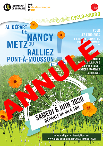 La 4ème édition de la cyclo-rando RMN2PAM (Raid Metz-Nancy to Pont-à-Mousson) prévue le samedi 6 juin 2020 n'aura pas lieu. Cet événement, ludique et convivial, était destiné à l'ensemble des étudiants et des personnels de l'établissement, ainsi qu'à leurs familles, et co organisé avec le CROUS Lorraine cette année.