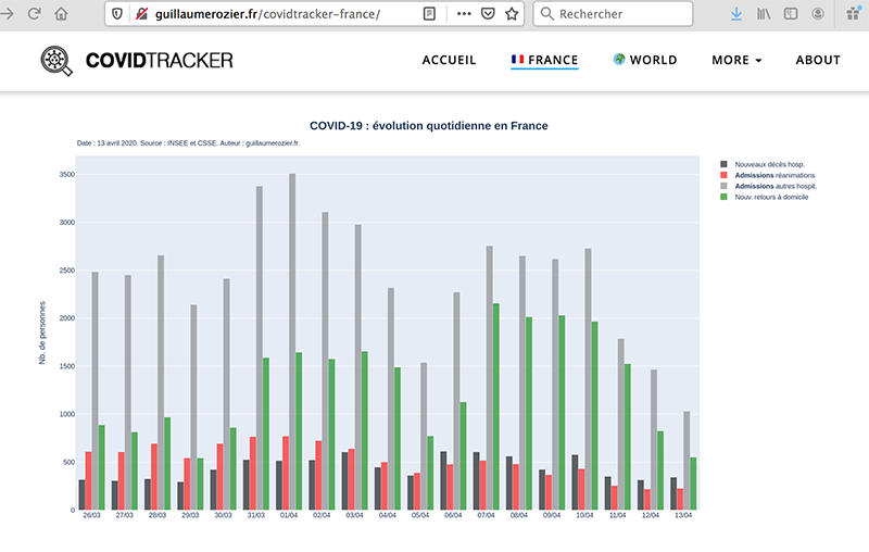 Il a ainsi développé des outils permettant de collecter de nombreuses données publiées par les gouvernements et les chercheurs sur le Covid-19 (notamment l’INSEE, Santé publique France et l’Université John Hopkins de Baltimore), de les stocker et de les analyser afin d’en tirer de l’information. Il a ensuite créé un site internet qui affiche des statistiques, des graphiques et des cartes animées permettant de suivre l’évolution de l’épidémie. Tous les outils développés sont Open Source : ils peuvent être téléchargés et modifiés librement et gratuitement sur Github : https://github.com/rozierguillaume/covid-19. Des modifications ont ainsi déjà été suggérées par la communauté afin d’améliorer ces outils.