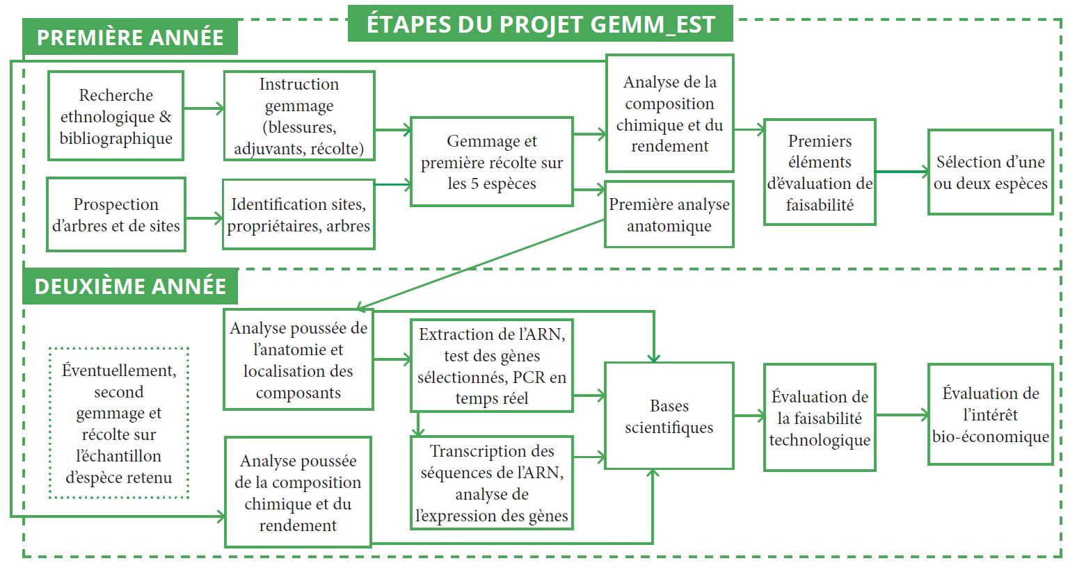 Le but de Gemm_Est est de tirer profit des pratiques anciennes et de comprendre les mécanismes de la surproduction de résine et d’acides résiniques intervenant en réaction à des blessures et à l’ajout d’adjuvants retardant la cicatrisation. Cinq espèces sont étudiées : le sapin argenté, l’épicéa commun, le sapin de Douglas, le pin sylvestre et le mélèze. Les deux espèces les plus prometteuses feront l’objet de recherches approfondies.