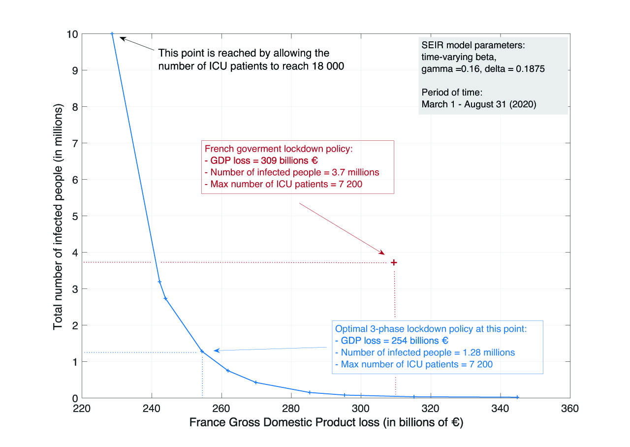 Légende de l'illustration : Cette figure permet d'estimer l'efficacité des mesures de confinement. L'efficacité est mesurée en termes de compromis entre le coût économique du confinement (perte de PIB) et le coût sanitaire (nombre de personnes infectées sur la durée de l'épidémie, sous contrainte de ne pas saturer les services de réanimation des hôpitaux).