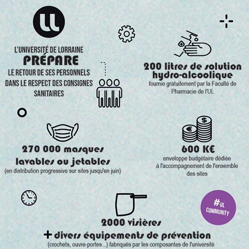 La situation de pénurie de masques et le pic de demandes pour la semaine de début de déconfinement du 11 mai a provoqué des retards dans les livraisons de gels et de masques, mais progressivement les fournitures commandées devraient parvenir aux agents de l’université grâce notamment au travail intense de la plateforme COVID UL créée par le magasin central et des livreurs de l’université. La situation de tension sur les approvisionnements est inédite compte tenu de la concentration extrême de la demande pour le triptyque masques FFP1, masques en tissu et solution hydro-alcoolique.