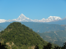 Légende photo : La majestueuse pyramide du Machapuchare (Fish Tail) dominant du haut de ses 7000 m les collines boisées du bas Himalaya (credit : Jérôme Lavé).
