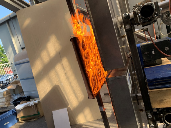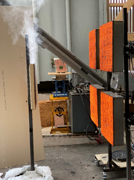 Pour étudier le comportement du bois au feu, le LEMTA a conduit, en collaboration avec le LERMAB*, des essais d’inflammation et de dégradation de panneaux en bois soumis à un flux de chaleur. Ces tests, réalisés à échelle intermédiaire, à l’aide de 4 panneaux radiants gaz de 50 kW unitaire, forment une surface totale d’éclairement de 1 m². Le but de cette campagne expérimentale est d’étendre les essais effectués à une plus petite échelle avec un banc expérimental, appelé cône calorimètre. Cette technique permet de définir les conditions d’inflammation des panneaux bois avec des conditions thermiques proches de celles rencontrées lors d’incendies. Il s’agit de vérifier que les résultats observés à petite échelle sont également applicables à plus grande échelle.