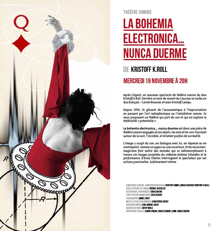 La bohemia electronica... nunca duerme est donc une pièce de théâtre sonore engagée où les objets, les sons et les voix tournent autour de la nuit, l’invisible, et éclatent parfois de surréalité. L’image y surgit du son, en dialogue avec lui, en réponse ou en contrepoint, comme un appui ou une ouverture. Et les musiciens-magiciens font naître des mondes qui se métamorphosent à travers ces images projetées du vidéaste Jérémie Scheidler et la performance d'Enna Chaton interrogeant le spectateur par ses actions ponctuelles. Sublimement intime.