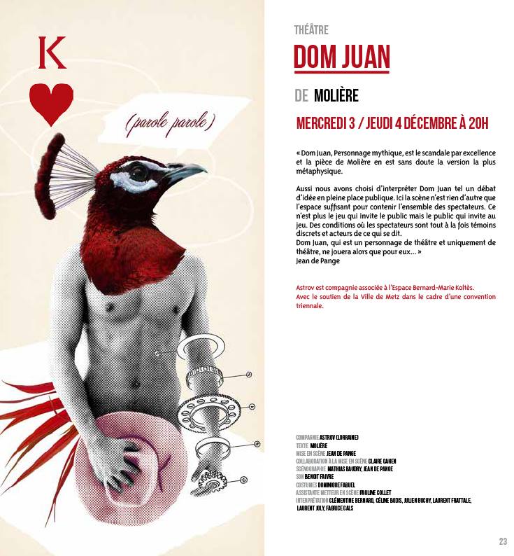 « Dom Juan, personnage mythique, est le scandale par excellence et la pièce de Molière en est sans doute la version la plus métaphysique. Aussi nous avons choisi d’interpréter Dom Juan tel un débat d’idée en pleine place publique. Ici la scène n’est rien d’autre que l’espace suffisant pour contenir l’ensemble des spectateurs. Ce n’est plus le jeu qui invite le public mais le public qui invite au jeu. Des conditions où les spectateurs sont tout à la fois témoins discrets et acteurs de ce qui se dit. Dom Juan, qui est un personnage de théâtre et uniquement de théâtre, ne jouera alors que pour eux… » Jean de Pange