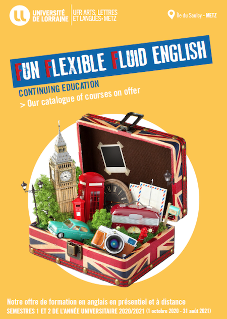 L’UFR Arts, Lettres et Langues Metz propose une offre de formation continue en langue anglaise, Fun Flexible Fluid English, composée de 7 modules courts. Accessibles en présentiel et à distance, ces formations s’adressent à un large public : aux professionnels du tourisme, de la restauration, à toute personne qui souhaite se remettre à niveau en langue anglaise, découvrir la culture d’Outre-Manche, ainsi qu’aux enseignants chercheurs pour la rédaction d’abstracts et appels à communication.