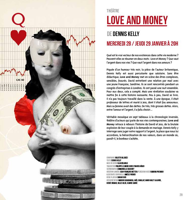 Quel est le vrai vecteur de nos existences dans cette vie moderne ? Peuvent-elles se résumer en deux mots : Love et Money ? Que vaut l’argent dans nos vies ? Que vaut l’argent dans nos amours ? Piquée d’un humour très noir, la pièce de l’auteur britannique, Dennis Kelly est aussi percutante que salutaire. Sans être didactique, Love and Money met en scène des êtres complexes, sensibles, fissurés. David entretient une relation par mail avec une jeune Française, Sandrine. Ils se sont rencontrés pendant un congrès d’entreprises à Londres. Ils ont passé une nuit ensemble. Pour eux deux, cela a compté. Mais une révélation soudaine va mettre fin à cette histoire naissante. Peu à peu, David se livre. Il n’a pas toujours travaillé dans la vente. À une époque, il était professeur de lettres et marié à Jess, dont il était fol amoureux. Mais sa femme avait des dettes. De très, très grosses dettes. Alors, entre l’amour et l’argent, il a fallu choisir…Véritable mosaïque en sept tableaux à la chronologie inversée, théâtre d’acteurs qui parle de nos vies contemporaines, Love and Money retrace à rebours l’histoire de David et Jess, de la brutale explosion de leur couple à la demande en mariage. Dennis Kelly y interroge sans juger notre rapport à l’argent, la place que nous lui accordons, la hiérarchisation de nos valeurs, dans un monde où, paraît-il, le bonheur s’achète.