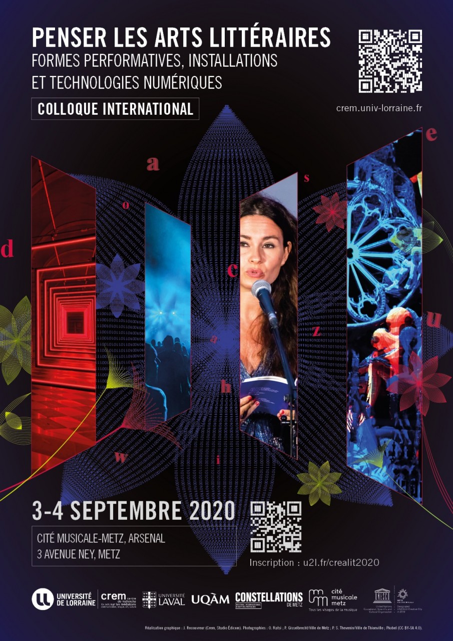 En partenariat avec la Ville de Metz à l'occasion de "Constellations", festival international d'arts numériques, le CREM, dans le cadre du projet CREALIT, (Création croisée arts littéraires) lauréat du fonds franco-québécois pour la coopération décentralisée, (ministère de l’Europe et des Affaires étrangères, ministère des Relations internationales et de la Francophonie) organise en partenariat avec l'université québécoise Laval et l'Université du Québec à Montréal un colloque international intitulé "Penser les arts littéraires", les 3 et 4 septembre, à l'Arsenal de Metz.