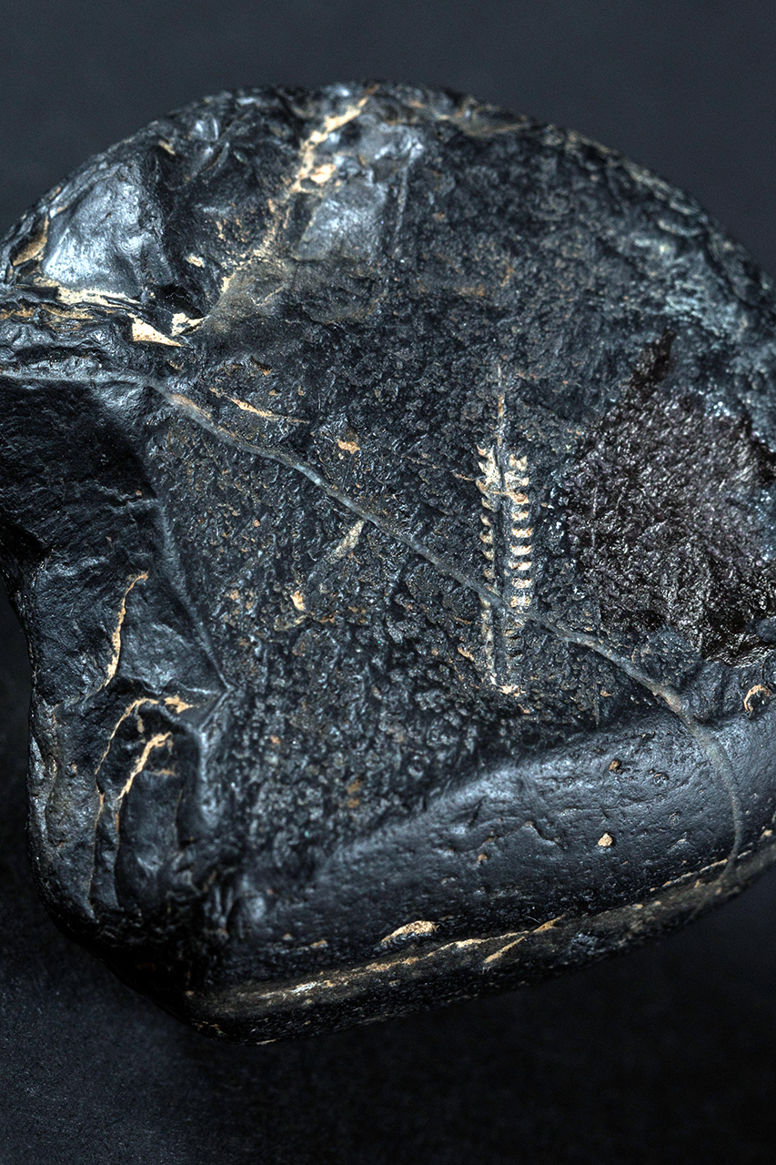 Objet 18/24 : Graptolite d’Épinal, dimensions : 6x5cm, décrit par Eugène Noël en 1905, identifié dans les collections d’enseignement de paléontologie du département Géosciences de Nancy en 2016, transféré vers les collections patrimoniales du Muséum-Aquarium de Nancy en 2017.
