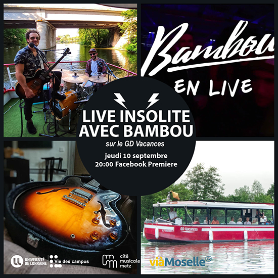 Bambou se sont prêtés au jeu du Live Insolite pour ce premier numéro. C’est sur le bateau GD Vacances que nous avons accosté pour une session musicale en live très spéciale, pour laquelle d’ailleurs le groupe a spécialement retravaillé ses morceaux. Le capitaine Benjamin Goujon nous a fait voyager à travers Metz et ses alentours, nous faisant découvrir le plan d’eau, le Temple Neuf, l’île du Saulcy ou encore le stade Saint-Symphorien sous un angle peu commun.