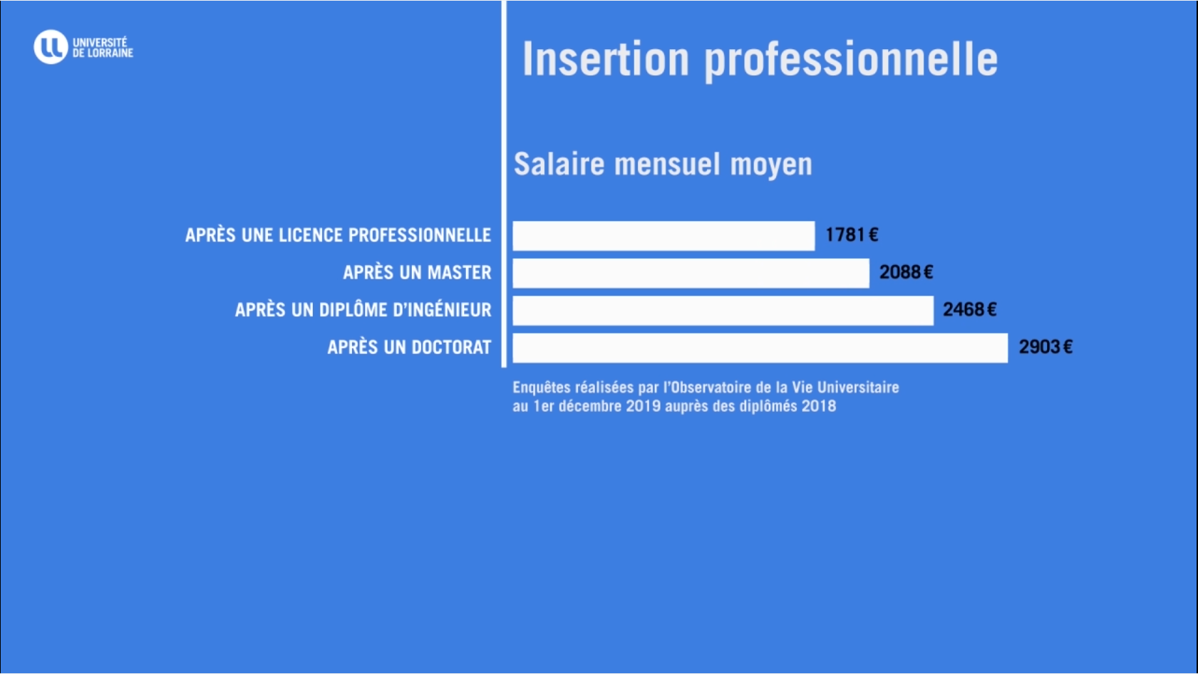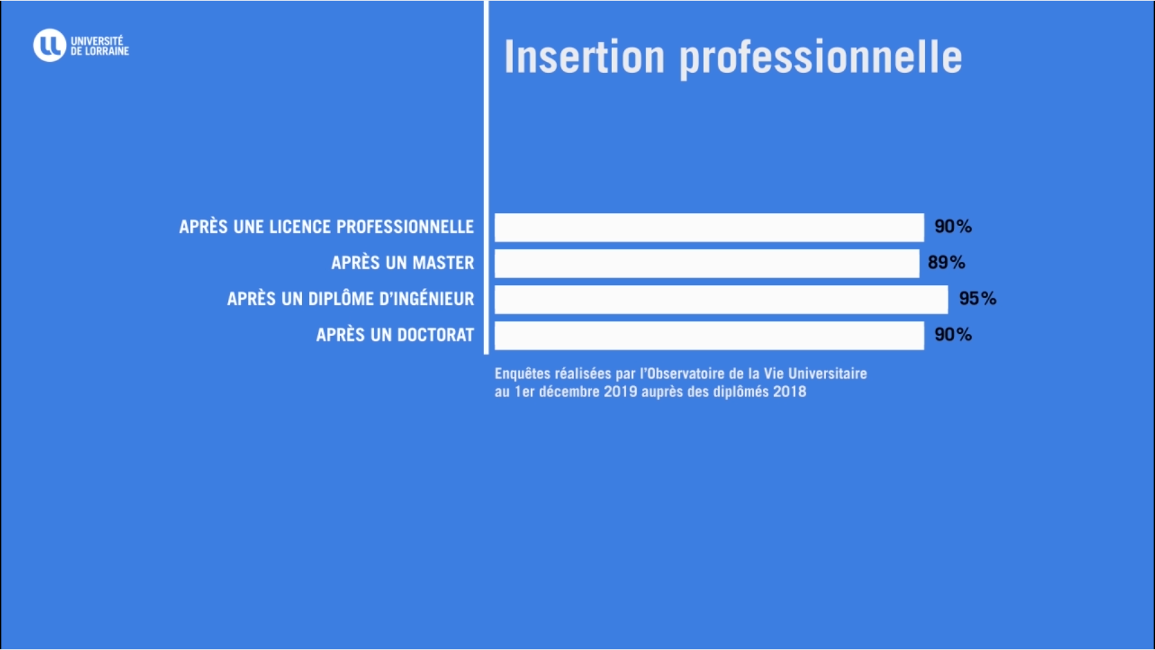 Les résultats des enquêtes sont consultables sur le site Internet de l’Université de Lorraine (www.insertion.univ-lorraine.fr). Les résultats des enquêtes menées en 2020, auprès des diplômés 2018, viennent d’être ajoutés.